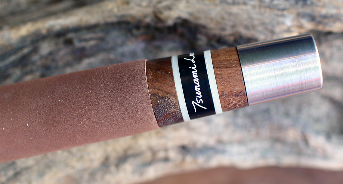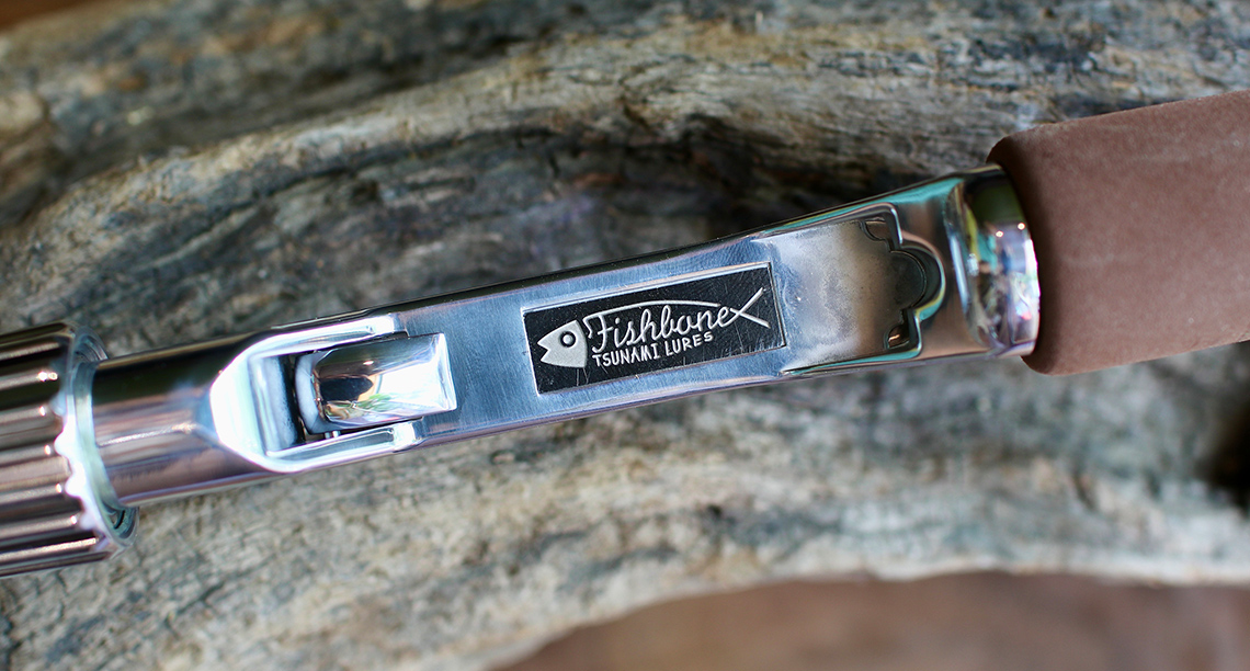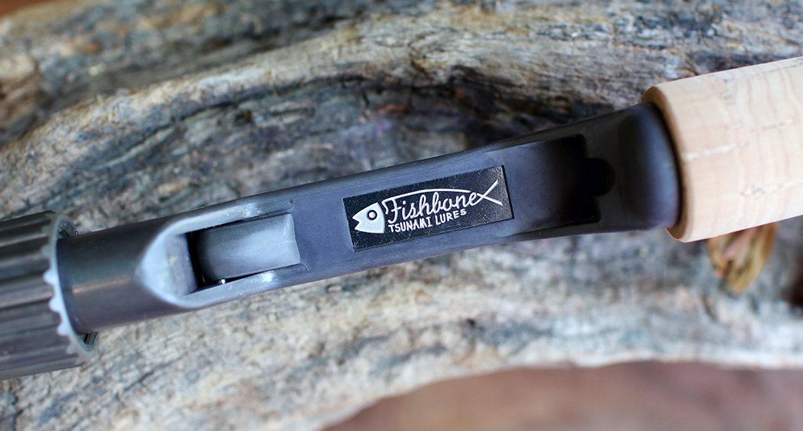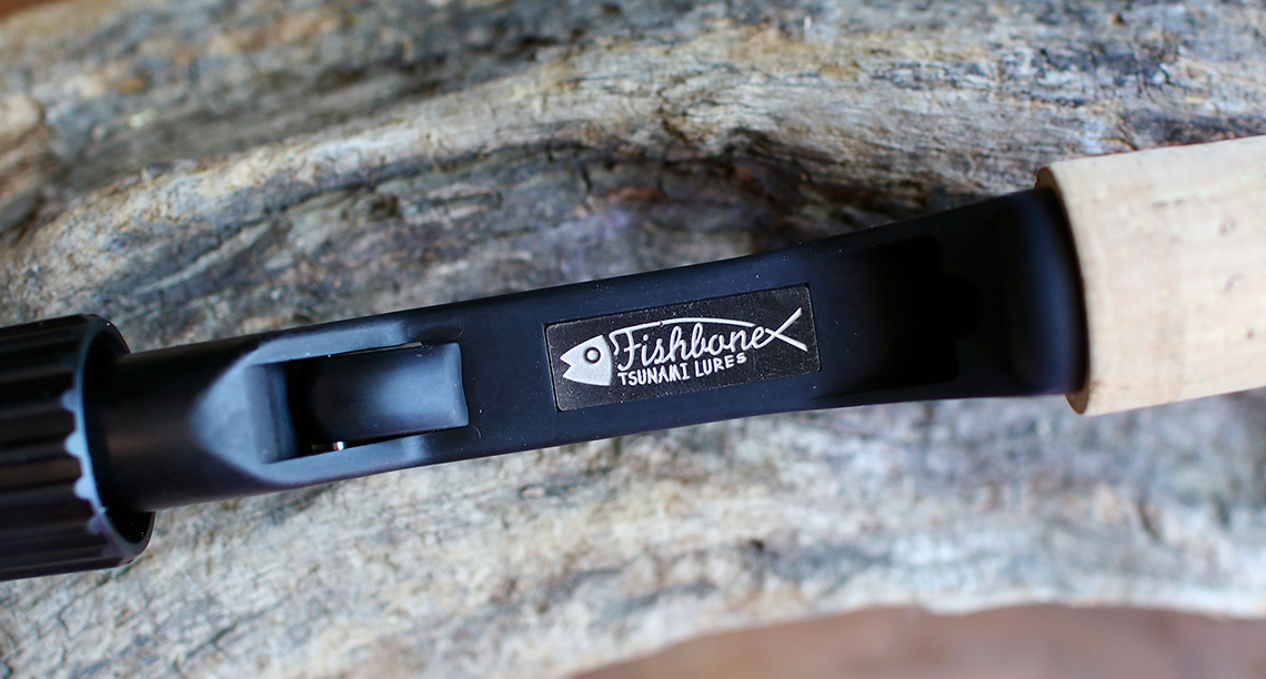ハンドル部は上からコルク、ウォルナット、ABS、ジュラコン(Tsunami Luresのネーム入り)、ABS、ウォルナット、そして削り出しのアルミ(バランサーも兼ねる)。リールシートにはFishboneのロゴを刻印したプレート付き。