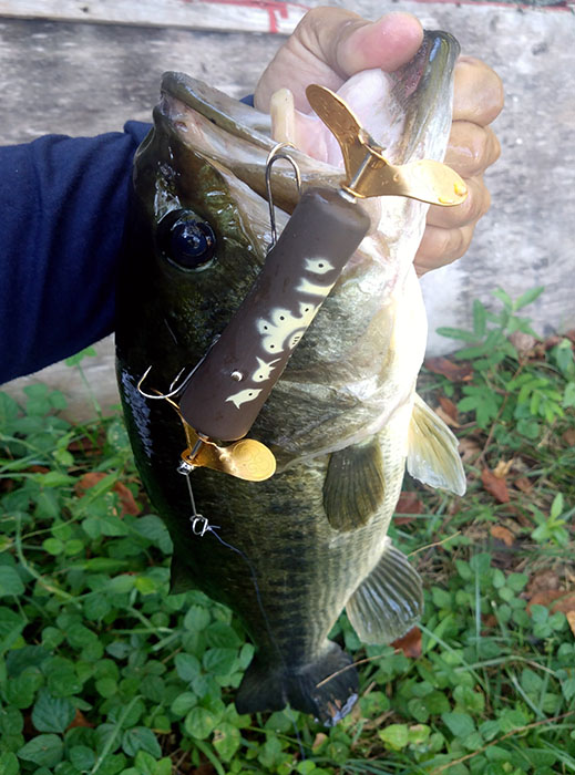 何度か調整し、キュルキュル音の出る素晴らしい勝手にタツマキアローが完成!かなり勢い良く流れ出しているインレットの脇へ勝手にタツマキアローキャスト。少し流れに乗せてから、ただ引き開始して来るとアロープロップのキュルキュル音が効いたかどうかは分かりませんが、いきなり激しくバイト!インレットに居るバスの引きは強く、モデルノ50M多分相当曲がっていたと思ますが、無事にキャッチ。最高です!本家タツマキアローの完成楽しみして待ってます!
