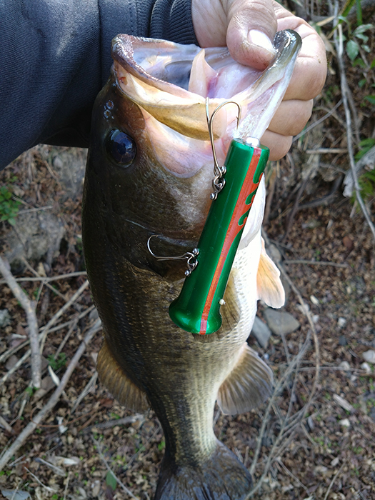 減水はしていましたが、水の色は良く、お目当てのポイントはゴミ溜まり最高な状況。一投目タツマキアロウを通して、ニ投目にソニックホーンキャスト。ステイ、ショートピッチの首振りアクションに激しくバイトしてくれたナイスコンディションなバス。痺れました!このまま水位回復無ければ、今年のスポーニングはメンターさんの餌食になりそうで心配です。
